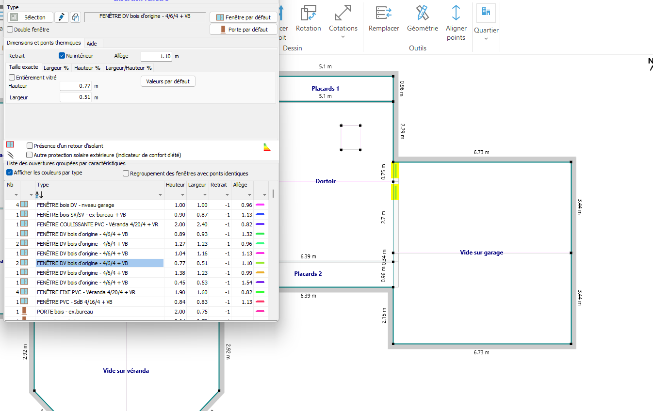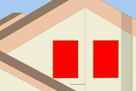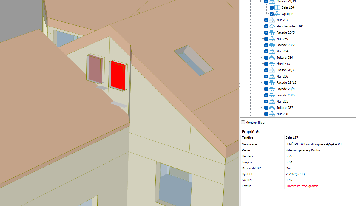 Je rencontre des difficultés pour la modélisation de 2 fenêtres d'une partie habitation qui est au-dessus d'une pente de toit de garage. Le modeleur me met ces zones en rouge au motif que les ouvertures sont trop grandes. Cependant, cela ne me semble pas réellement venir de la taille de l'ouverture puisque même en modifiant les dimensions et allège, le problème persiste.